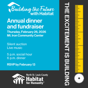 RSVP by February 13—all guests must reserve or purchase seats in advance. Contact us at 218-749-8910 to discuss sponsorship opportunities or to donate a raffle or silent auction prize.